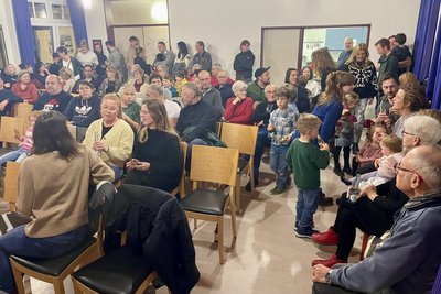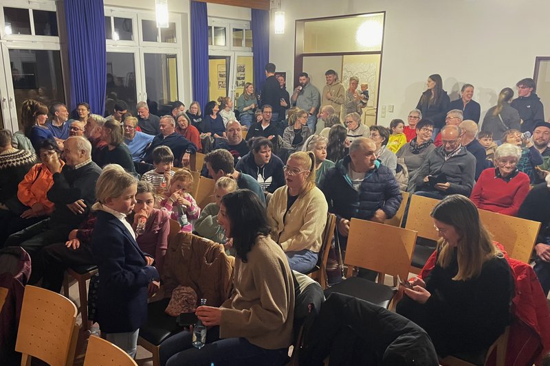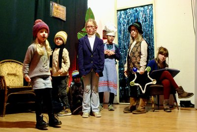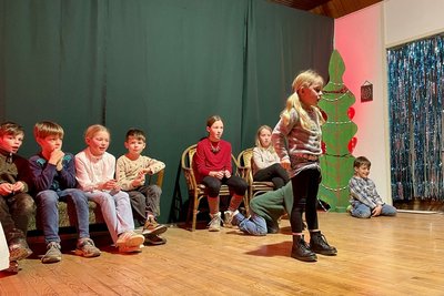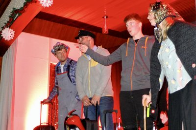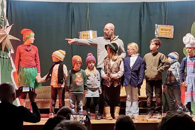 Das Gemeindehaus war bis auf den letzten Platz besetzt, viele Gäste konnten wir auch aus Krastel begrüßen. Die Kleinsten trauten sich mit ihren Gedichten auf die Bretter, die die Welt bedeuten und ein kleines Theaterstück über die Rivalitäten der zwei Dörfer Krastel und Woord rief so manchen Lacher hervor. Jedes Ort beanspruchte für sich das schönste Dorf im Hunsrück zu sein. Das Verschwinden vom Woorder Weihnachtsstern brachte die Menschen aus Woord allerdings in Rage und die Krasteler kamen in Verdacht dahinterzustecken. Diese wiesen allerdings es mit dem Hinweis auf ihren eigenen recycelten Stern zurück. So begann der Sternenstreit und tief im Wald kicherte ein Wichtel über dieses Schauspiel. Denn er hatte den Stern gestohlen und machte sich einen Spaß daraus das Gezänke zu beobachten.