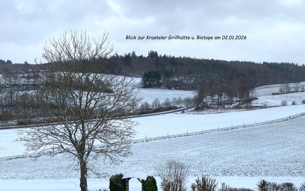 Wetter am 09. Januar 2026 um 19:30 Uhr = regnerisch und 1,0°C. Niederschlag im Monat = 21,0 Ltr. / höchste Temp.im Monat = 4°C. tiefste Temp. = -8°C. (Schneehöhe: 4,0 cm von 2.01. bis 8.01.).Anfang Januar Dauerfrost bis -7°C.bis 7.01.